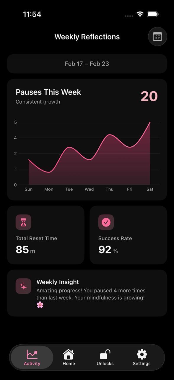 After you complete a pose, you get unlocked time—choose how long. A short cooldown keeps the flow healthy. Your dashboard shows how often you paused and unlocked with yoga—positive reinforcement that keeps you motivated.
